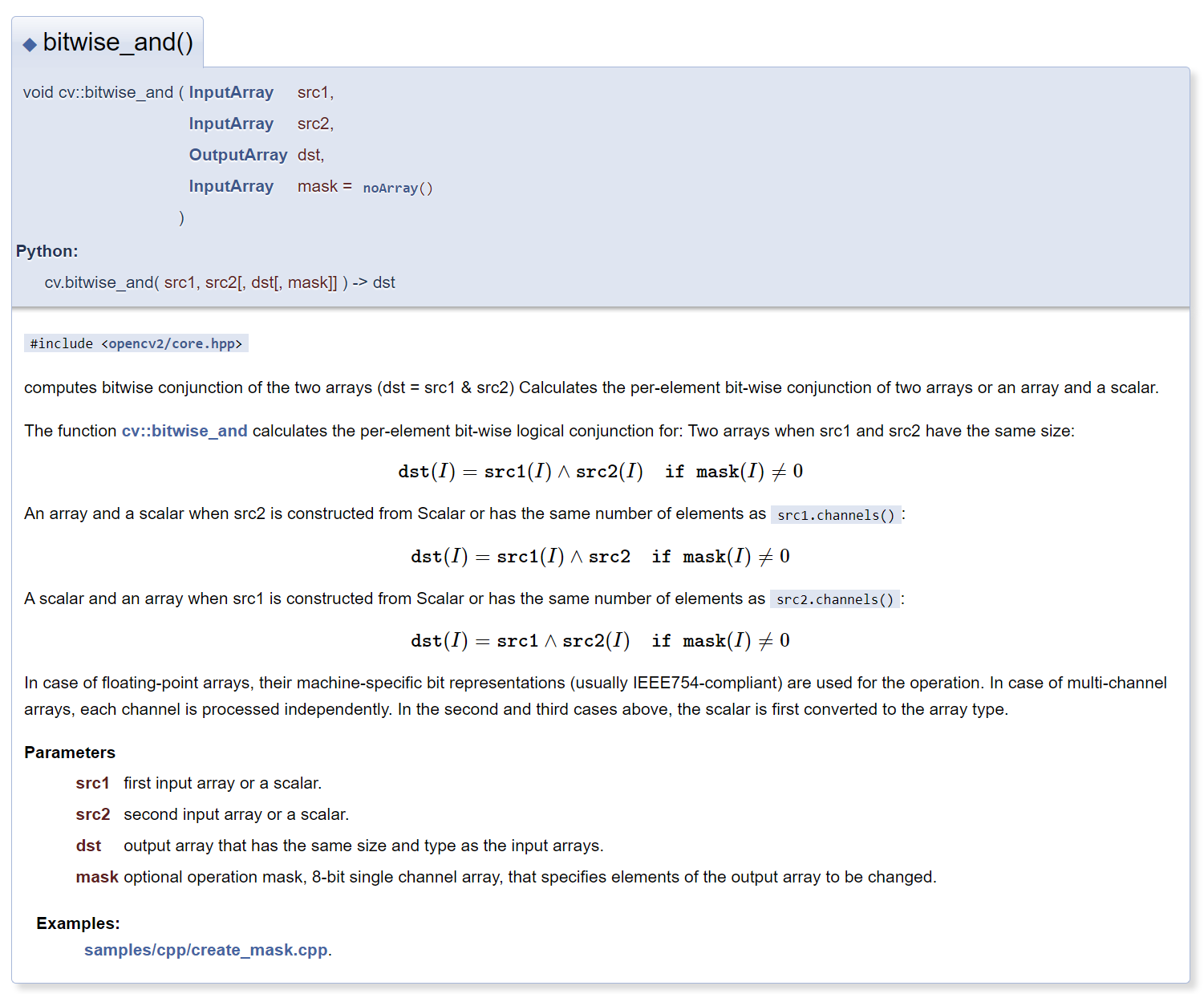 opencv 공식 document에서 bitwise_and()에 대해 설명되어 있는 내용이다.